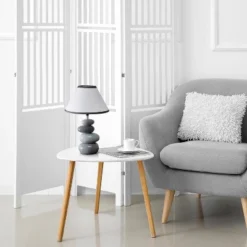 Stones of ceramic in light and dark gray variations stack vertically to create a lovely sturdy base beneath the empire fabric shade in white with dark gray trim. This unique table lamp is the perfect fit to add a little neutral colored décor to your space whether in your home or office.
