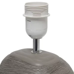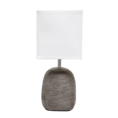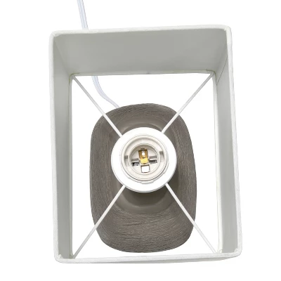 This cute and trendy table lamp is made of ceramic and topped with a rectangular white fabric shade. This light is ideal for anyone seeking a neutral, yet stylish lamp for their space. The textured brown/gray base allows this lamp to match perfectly to most décor settings! Thought this item looks somewhat stone like, it is in fact lightweight and more of a “petite” lamp. Note dimensions for reference.