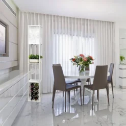 Reserve some of your best wine while illuminating your living space in style with our floor shelf lamp and wine rack. This gorgeous piece adds versatility as the shelves can be used to display photographs and other memorabilia, while accommodating space for your wine glasses and bottles. The linen lamp shade casts a soft, warming light throughout your living space. This lamp adds sophistication and style to any home’s décor.