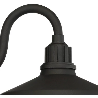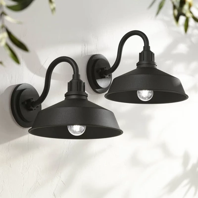 A careful balance of rusticity and elegance, this set of two farmhouse outdoor wall lights is the perfect addition to your patio or balcony. In a classic urban barn style with a curving gooseneck arm, they invoke a charmingly old-fashioned feel with an industrial character. A smooth black finish gives these fixtures a clean, almost contemporary touch. Vertical installation only.