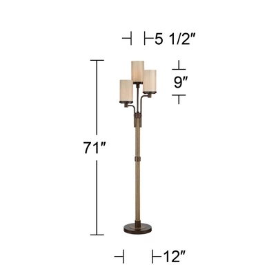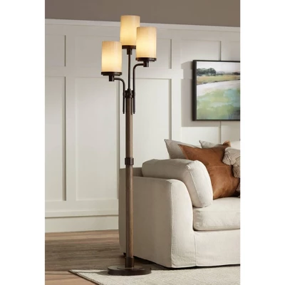 Bring beautiful illumination into your home with this design from Franklin Iron Works. This metal floor lamp comes in a faux wood finish, with bronze finish accenting for a handsome, hardy look. The frame branches up into three arms, each of which supports a tea alabaster glass shade. The result is a convenient three-light tree floor lamp in an industrial farmhouse style, perfect for brightening up a living room or bedroom space.