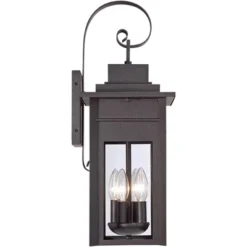 Outfit your outdoor spaces in traditional style with the Bransford collection of outdoor lighting fixtures. This outdoor wall light has a timeless look, and comes in a dark black-specked gray finish. It has four candelabra style lights within and a handsome scroll arm up top.