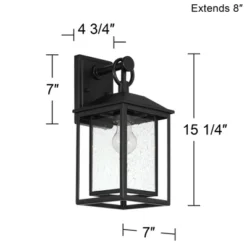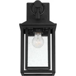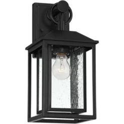 Inspired by classic Mission-style designs, this outdoor wall light is a handsome addition to a porch or patio area. It comes in a straight-lined metal frame, with a textured black finish that adds richness and contrast. The textured glass panels add a charming rain-washed effect to this fixture.