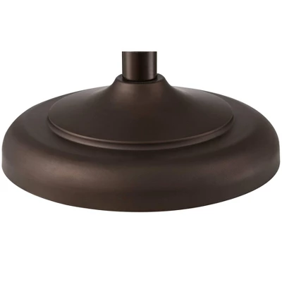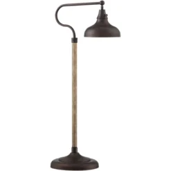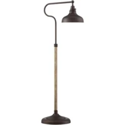 From the Franklin Iron Works brand, this adjustable downbridge floor lamp is inspired by classic pharmacy styles. Constructed from metal, it features bronze and faux wood grain finishes and a bent arm for a rustic-industrial farmhouse look. The wide metal shade directs light downwards and has an on-off switch located near the top.
