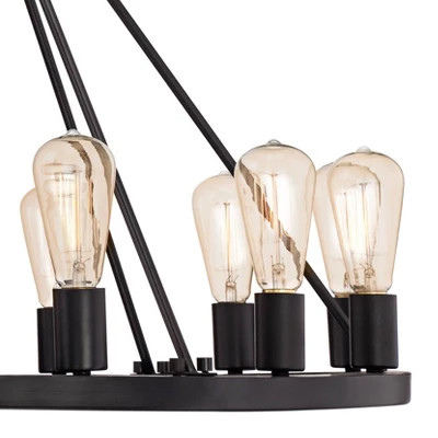 - Modern rustic industrial twelve-light chandelier. Round wagon wheel shaped ring frame. From the Franklin Iron Works™ brand.