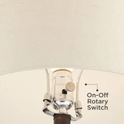 Add a hardy industrial look to your nightstand or side table with this rugged metal table lamp from Franklin Iron Works. The reddish-bronze finish base is cleverly designed to resemble a traditional coal miner’s lantern, with a clear glass accent in the middle. An oatmeal fabric shade on top is the perfect finishing touch to this handsome design.