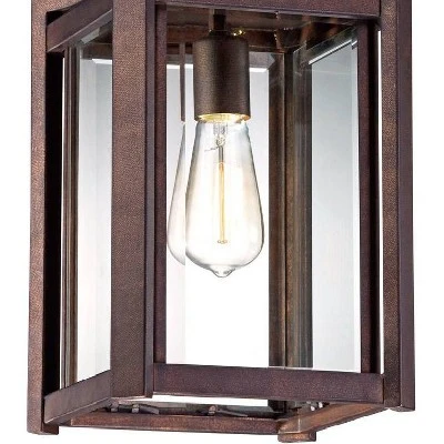 The Rockford collection by Franklin Iron Works offers a transitional style with a rustic touch. This outdoor hanging light comes in a warm bronze frame that holds clear beveled glass panels in between the slats. Use it to illuminate a porch, patio, garage, or balcony space. A decorative light bulb in a charming vintage Edison style is included with this fixture.