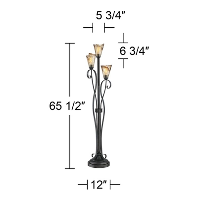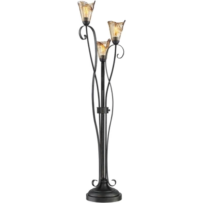 An elegant nature-inspired design from Franklin Iron Works, this three-light tree floor lamp comes in a powder-coated black finish metal frame. Decorative scrolls that resemble stems and leaves accentuate the lamp. The amber glass shades come with wavy edges and are designed after tulip buds. The result is a lovely transitional country-cottage look for your living room or bedroom.