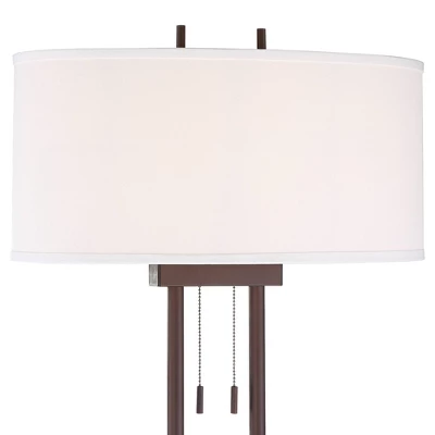 - Bronze and walnut finishes. Metal and wood construction. Oval hardback linen shades. 8-foot long brown cords and plug.