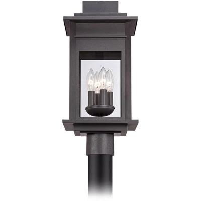 - Black-specked gray finish steel light. Clear glass panels. Matte black finish pole.
