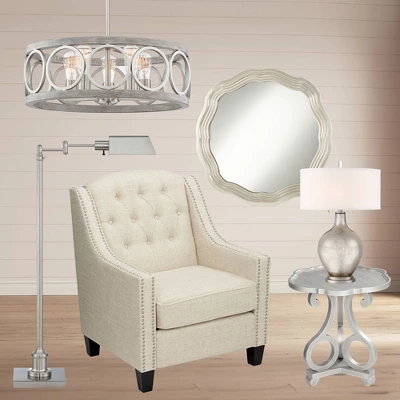 - Dual-tone brushed nickel and gray wood finishes. Metal construction. Open drum shade design.