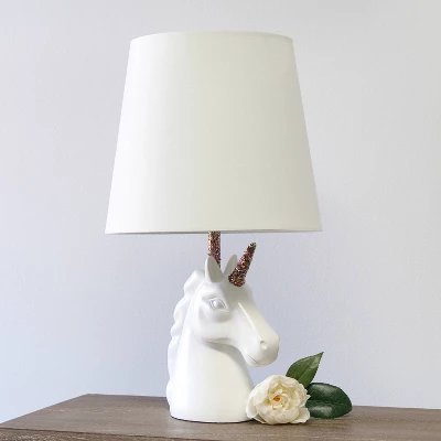 Add a touch of personality to your décor with this fun unicorn lamp! With a white resin base, white tapered fabric shade and touches of shimmering rainbow glitter this lamp is sure to illuminate any room in style. This lamp is perfect for bedrooms, kids and teens, college dorms or nurseries!