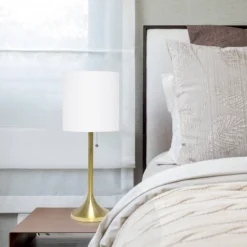 This fun and fashionable desk/task lamp features a gold metal base and white fabric drum shade making it the perfect addition to your lighting needs. This lamp will add simplicity and style to any space in your home. Perfect for bedrooms, kids and teens, college dorms, nurseries, or fun offices!